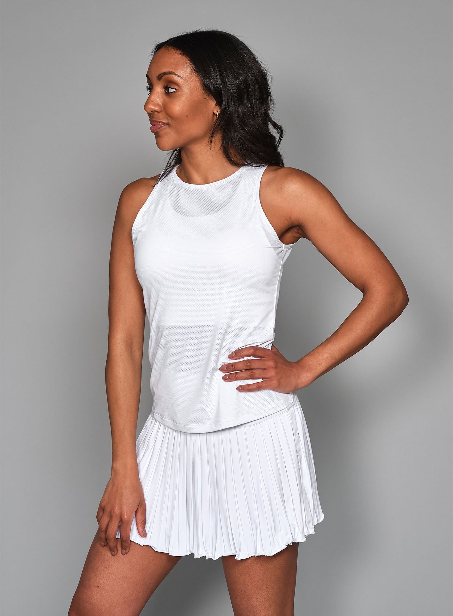 Women’s Mesh Tank is a modern classic with a relaxed, but fitted form and a higher neckline. The tank is made of a soft and breathable mesh material that leaves you cool and comfortable. Works for both sweaty gym workouts as well as all forms of racket sport. Style with one of our skirts or tights depending on which activity you are participating in.